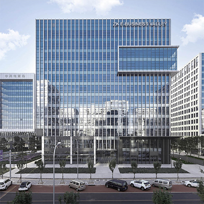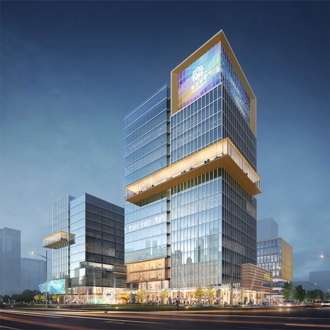 项目主要包括四栋办公楼、裙房及中间围合而成的广场。高低错落的两栋塔楼临近西侧城市主干道,另外两栋低层办公楼位于项目东侧。