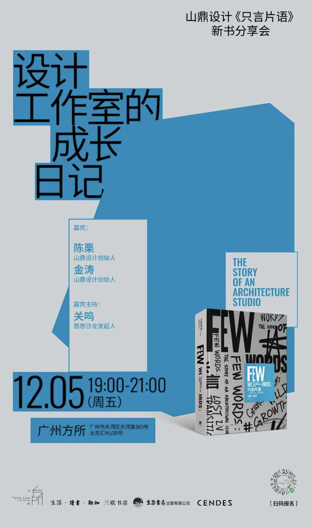 12月5日晚19点,山鼎设计工作室创始人陈栗、金涛,思想沙龙发起人关鸣,将在广州方所,分享《只言片语》这本新书。