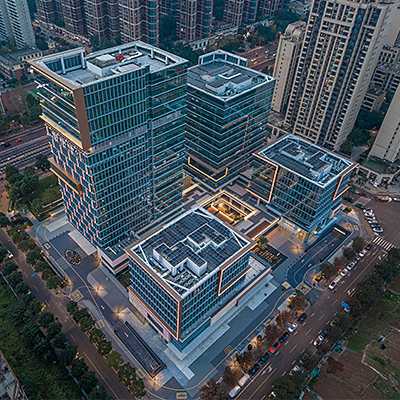 项目主要包括四栋办公楼、裙房及中间围合而成的广场。高低错落的两栋塔楼临近西侧城市主干道,另外两栋低层办公楼位于项目东侧。