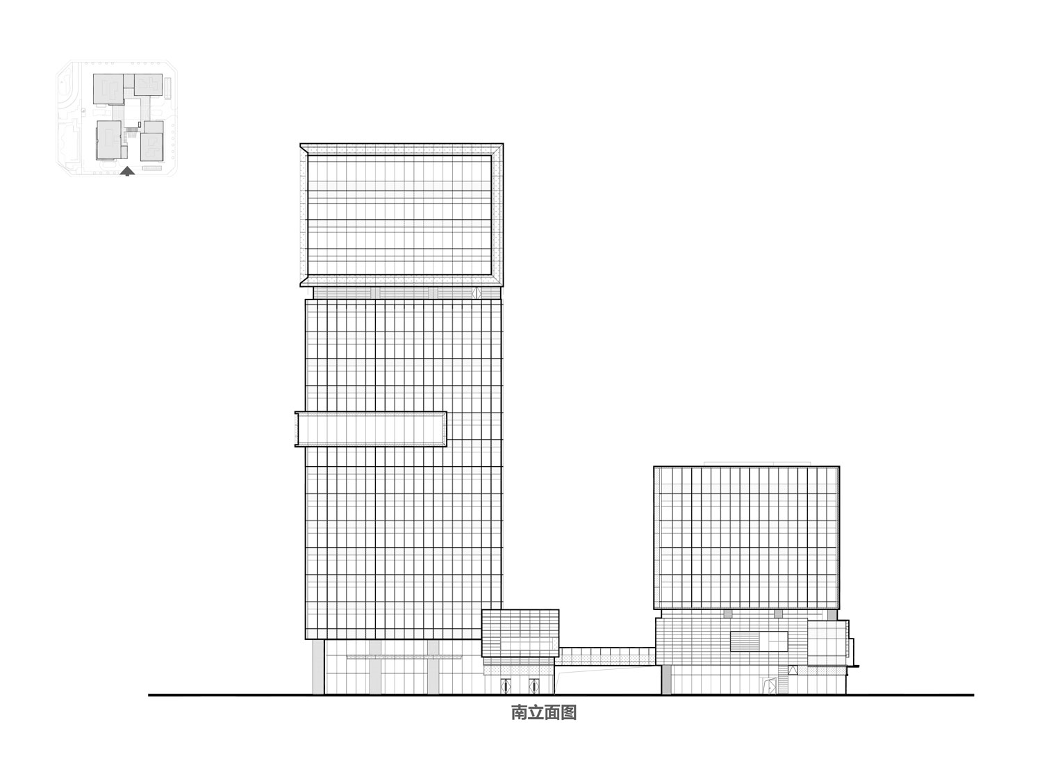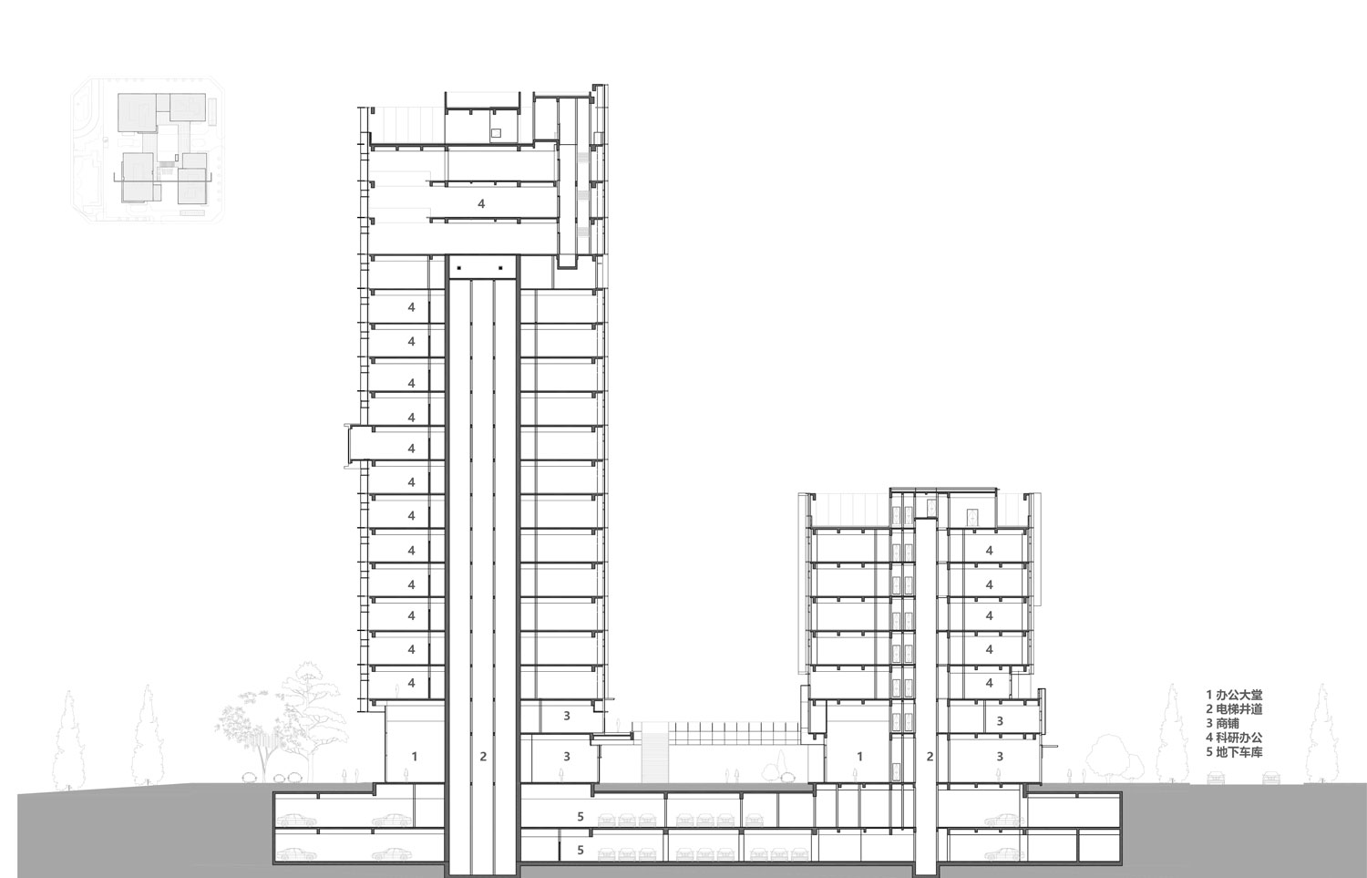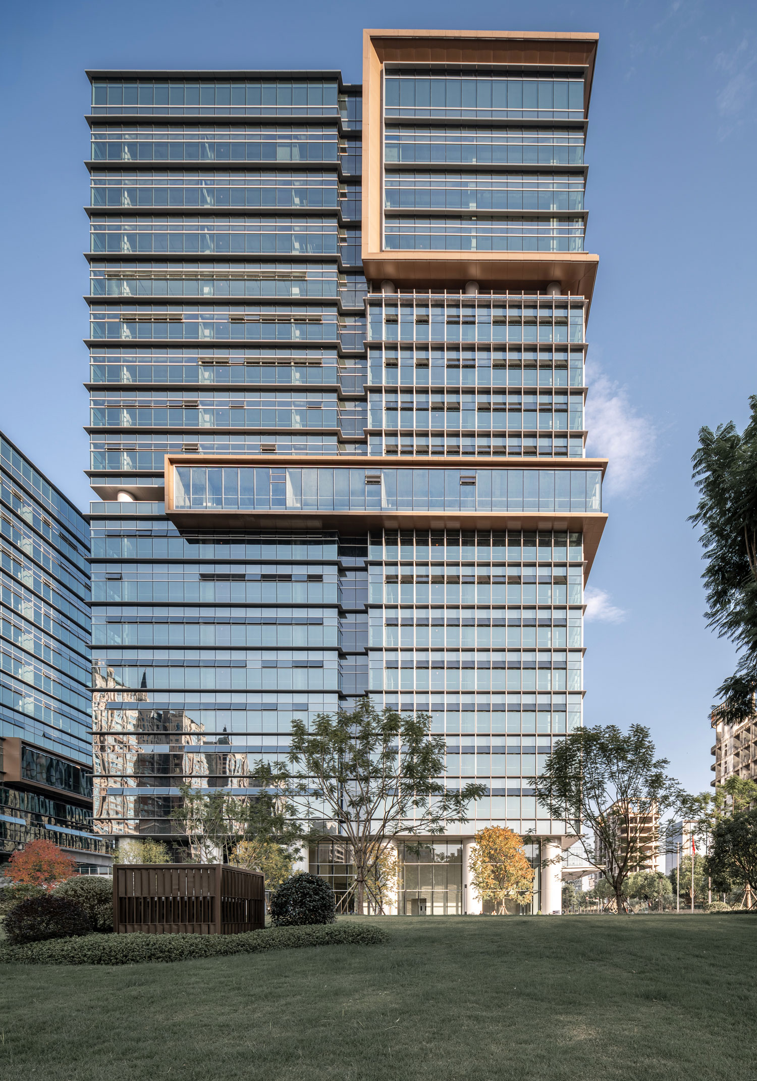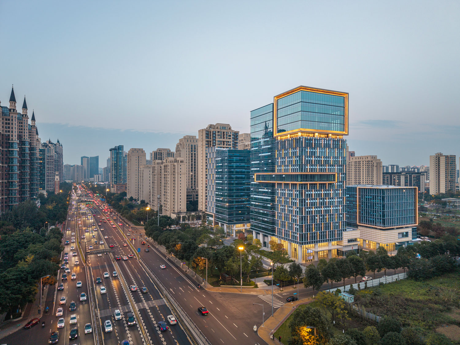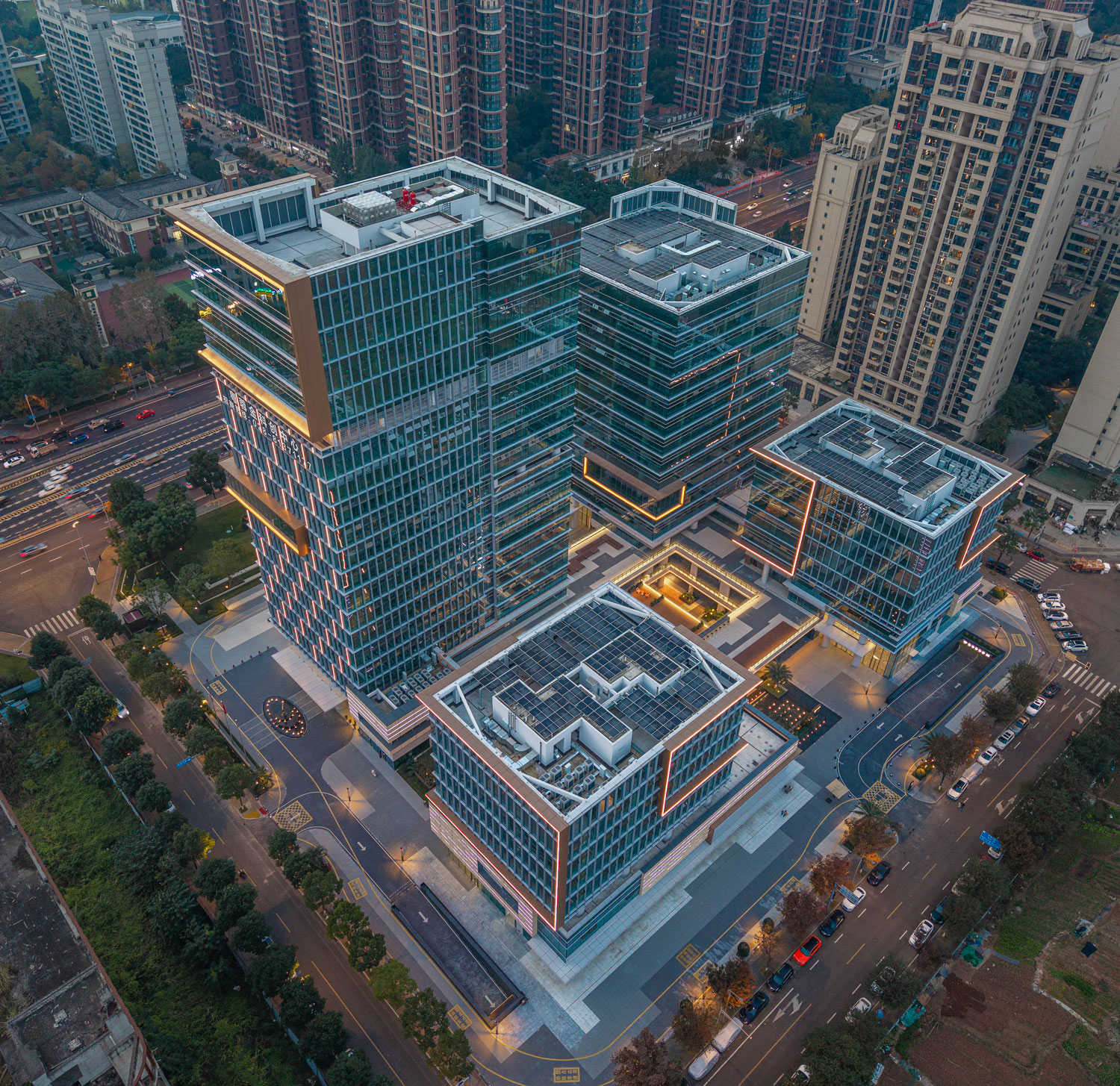 项目主要包括四栋办公楼、裙房及中间围合而成的广场。高低错落的两栋塔楼临近西侧城市主干道,另外两栋低层办公楼位于项目东侧。四栋建筑形成错落有致的空间形态和连贯而丰富的城市天际线。标志性的裸眼3D屏幕位于项目最高办公楼的顶部,是宣传、引流的高新之窗。