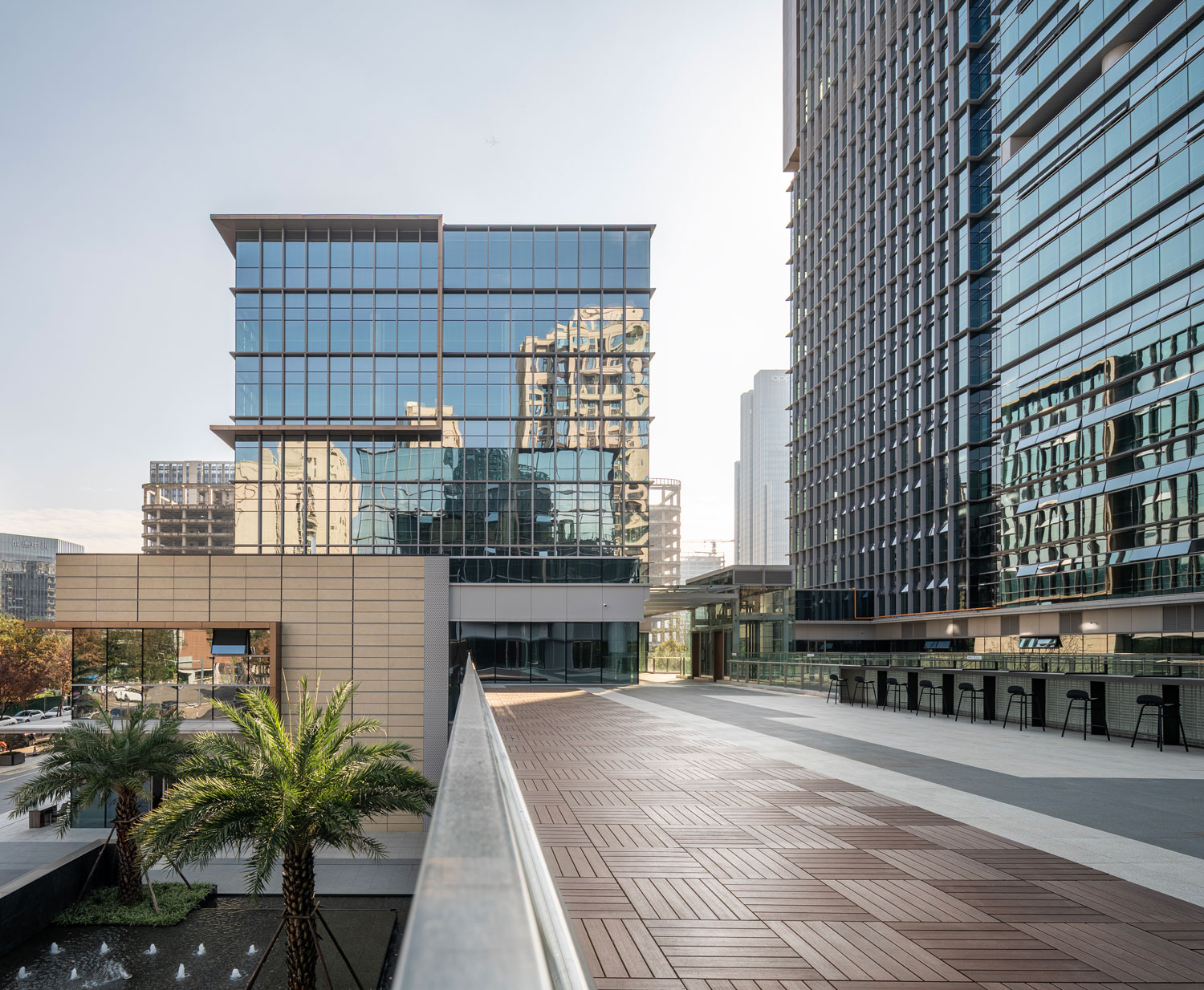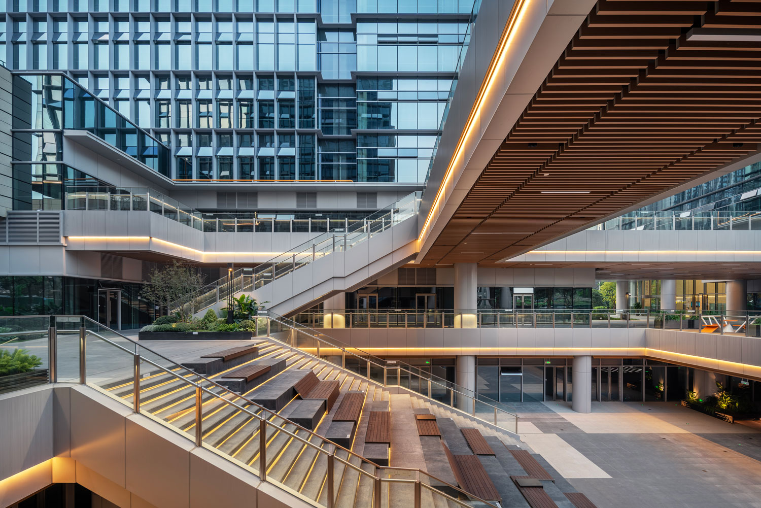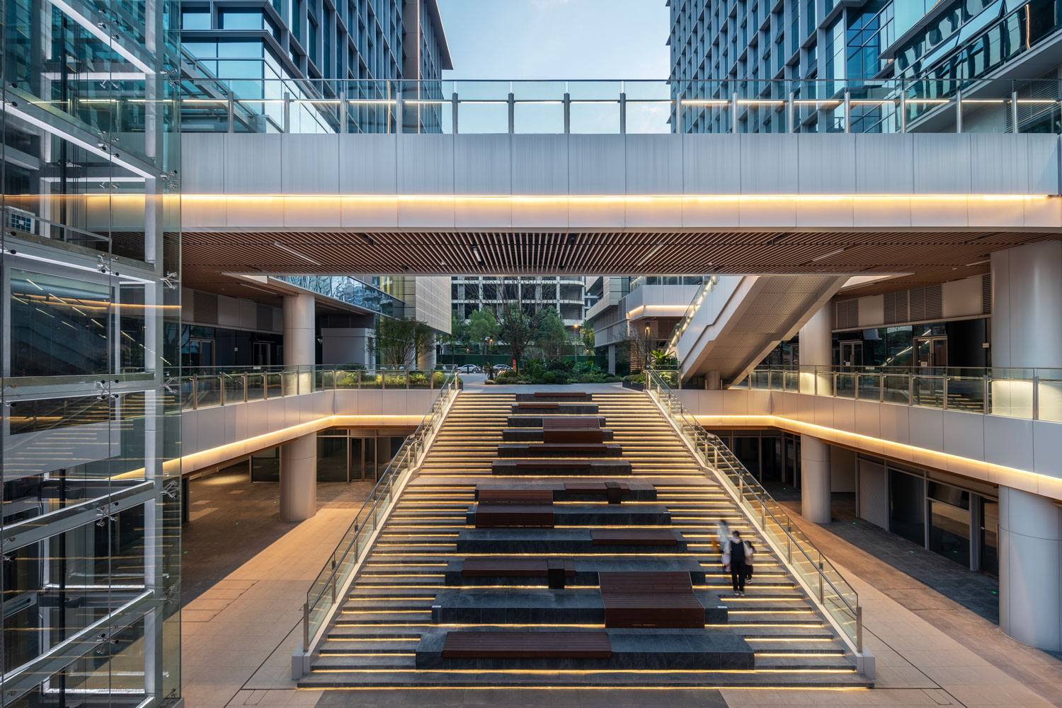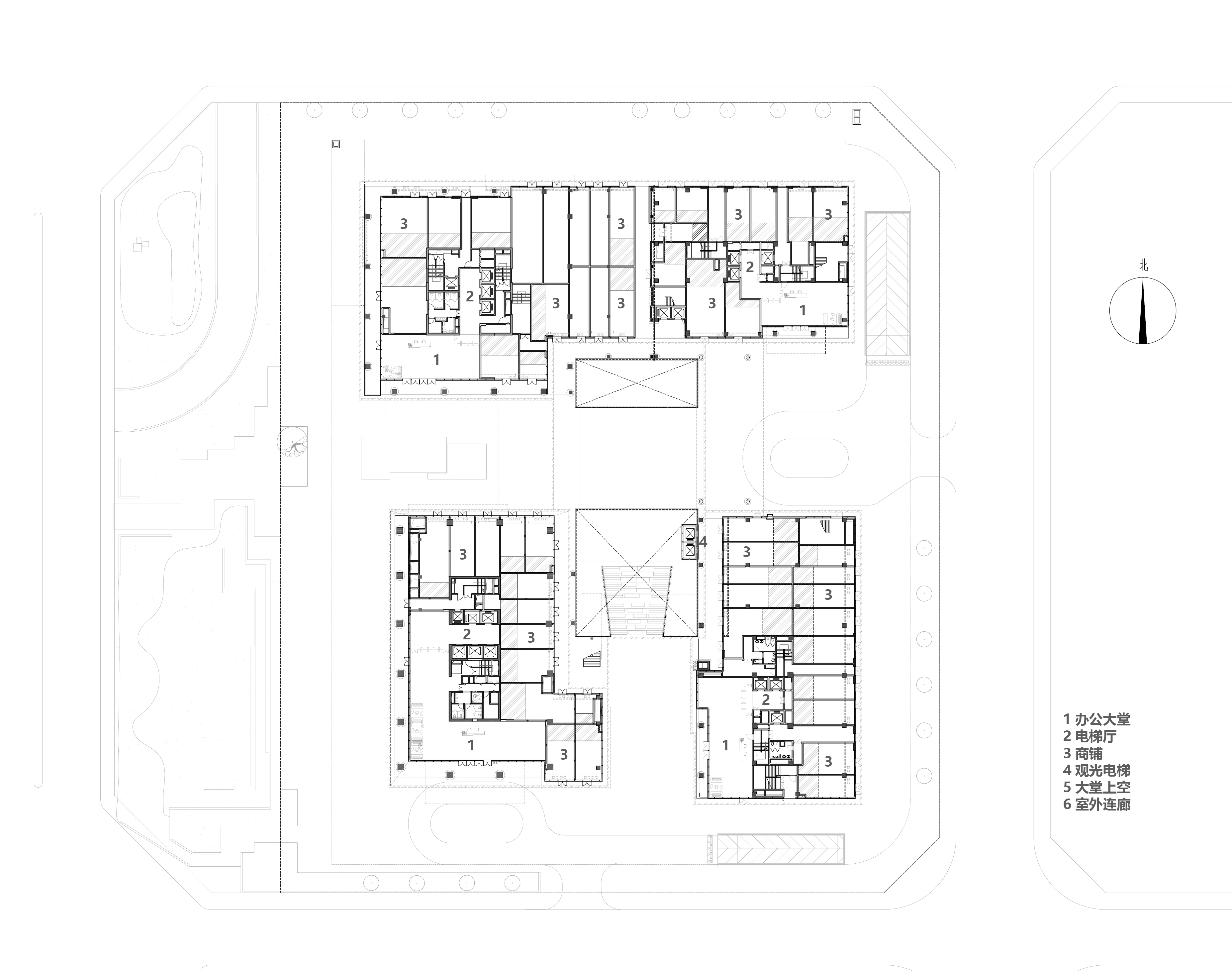 四栋办公塔楼围合,在基地内部形成了一个以立体的步行空间为主导的下沉式商业广场和城市花园,建筑内部如会议洽谈、发布会、艺术装置等多种功能与城市联系起来,多元化的业态承载着丰富的城市场景。