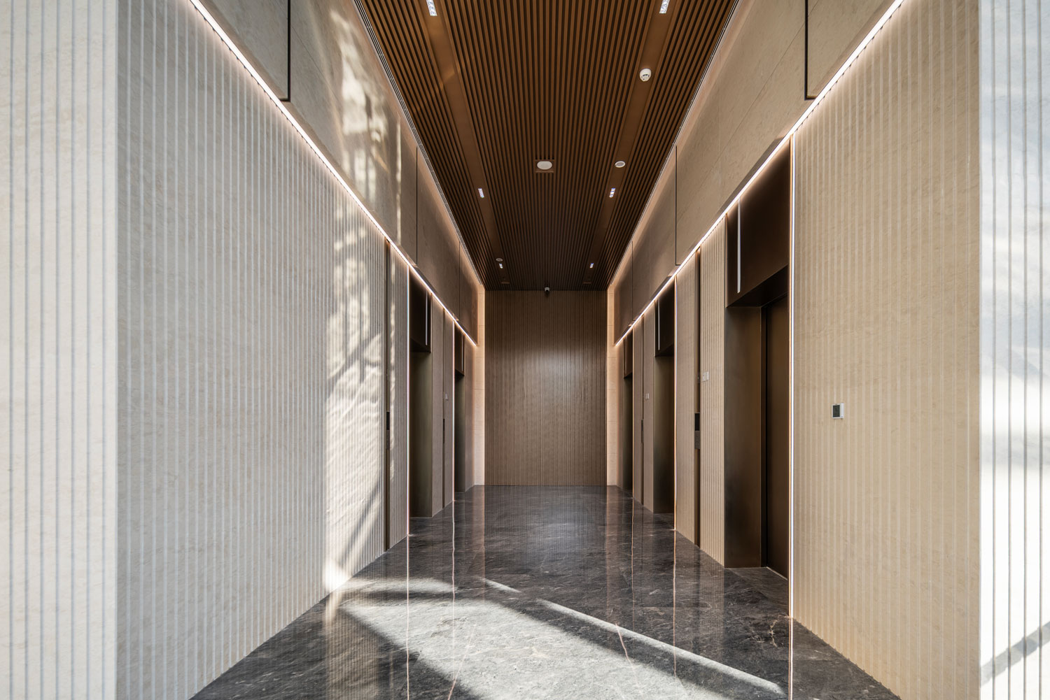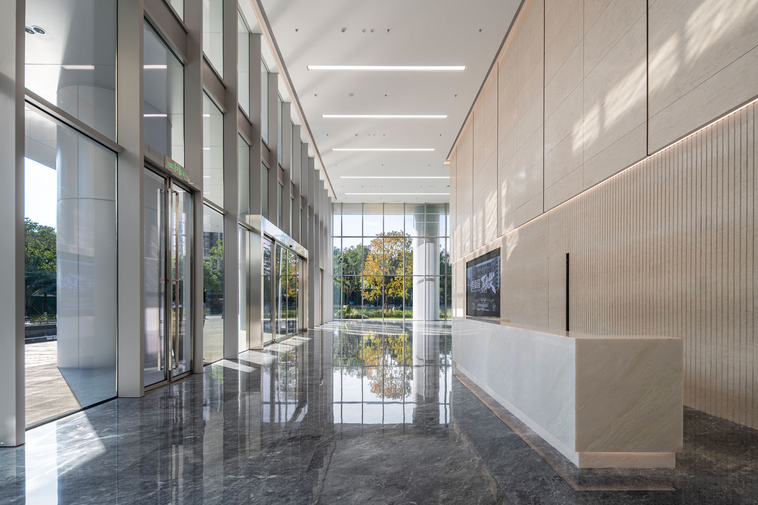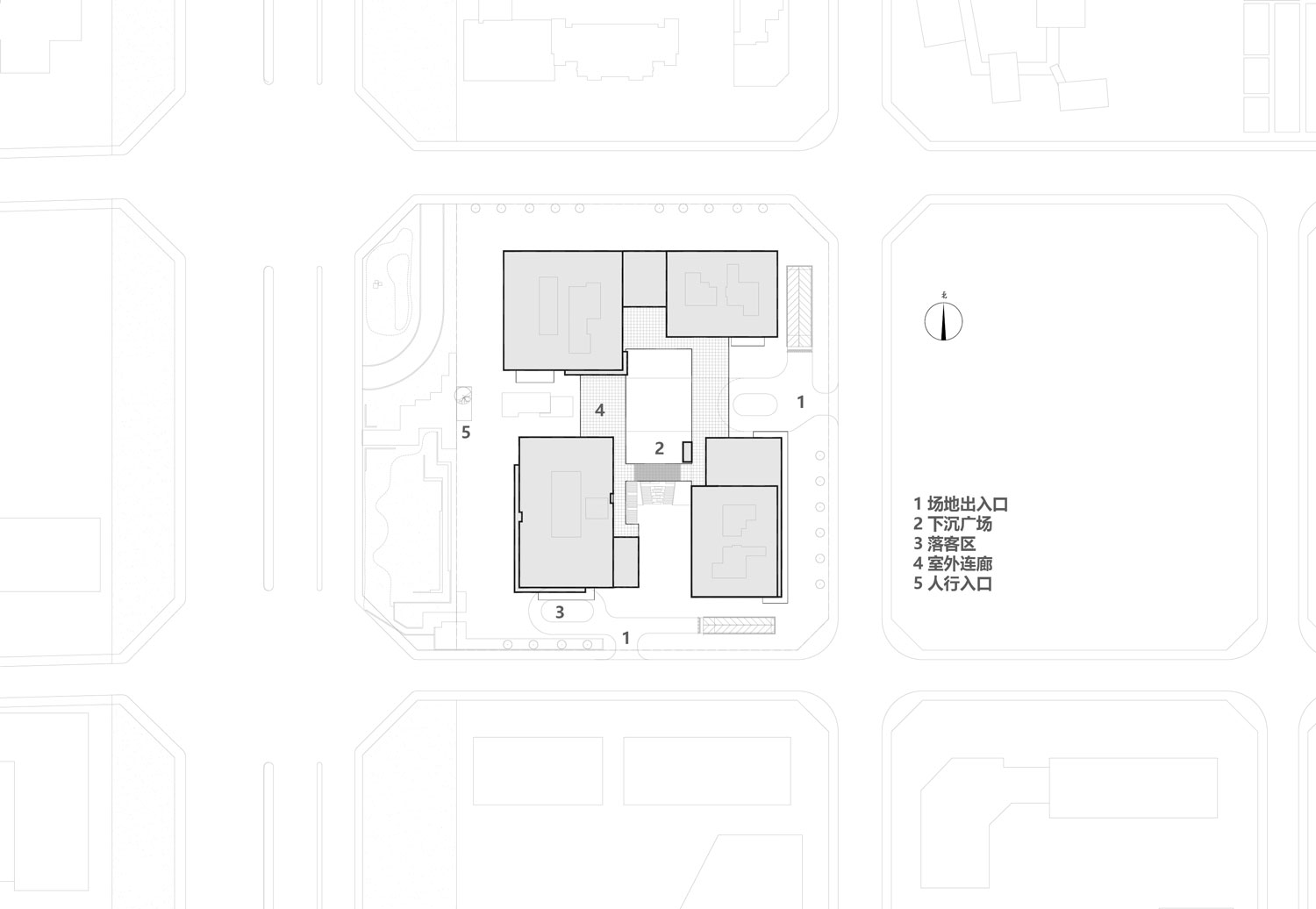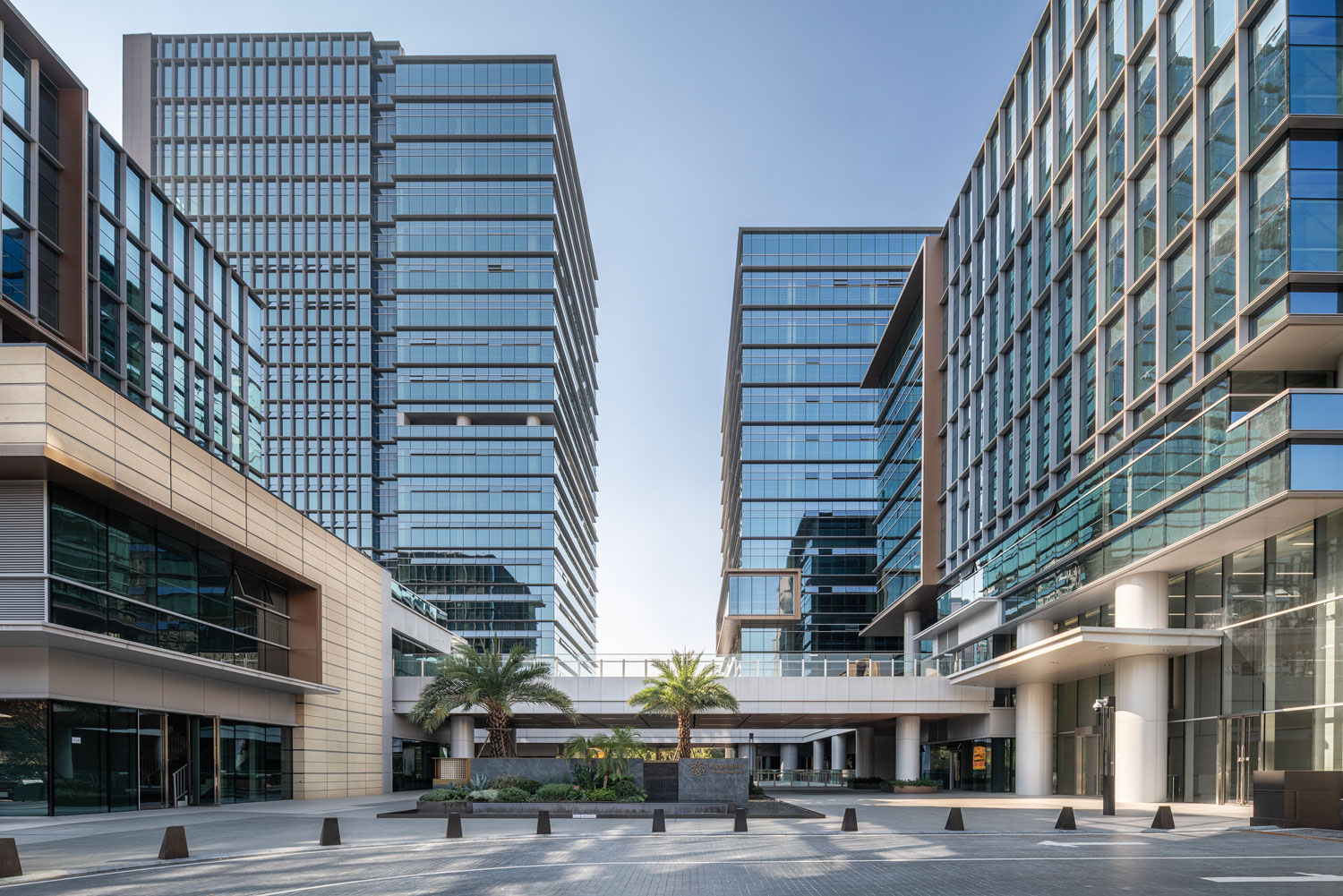 四栋办公塔楼围合,在基地内部形成了一个以立体的步行空间为主导的下沉式商业广场和城市花园,建筑内部如会议洽谈、发布会、艺术装置等多种功能与城市联系起来,多元化的业态承载着丰富的城市场景。